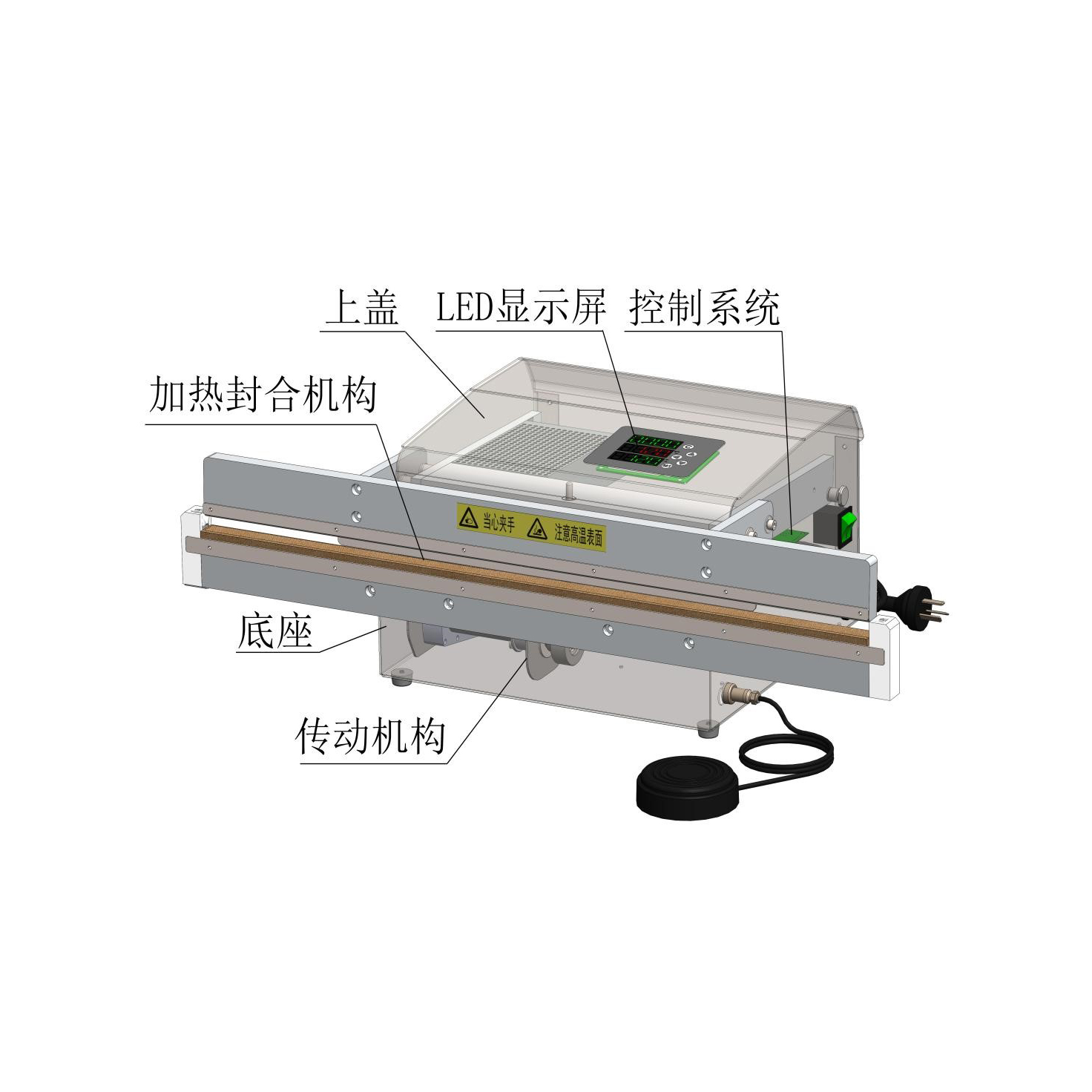 3、自動(dòng)運(yùn)行:LED雙色高亮數(shù)碼管顯示,可設(shè)置熱封溫度和冷卻時(shí)間,保證熱封后的安全溫度,操作簡(jiǎn)單,使用方便。